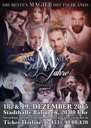 Wie alle Jahre findet Ende Dezember in Balingen die Gala der Großillusionisten Marc & Alex statt. Doch die Gala am 18. und 19. Dezember 2015 war eine ganz besondere. Denn die zwei Großillusionisten feiern ihr 25-jähriges Bühnenjubiläum und laden dafür, wie die Plakate versprechen, die besten Zauberkünstler Deutschlands ein. Und so viel vorweg, diese Erwartung wurde auch zweifelsohne bestätigt.