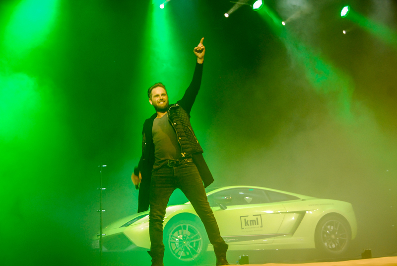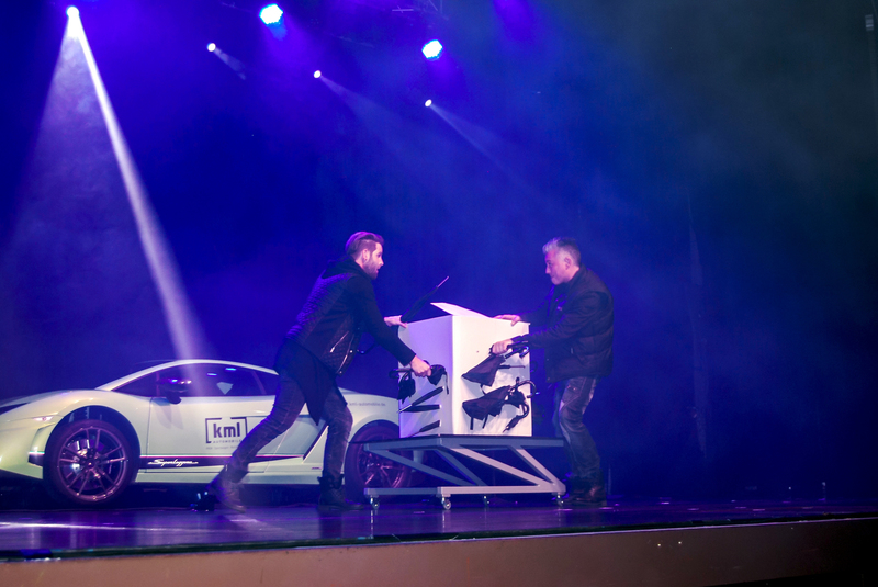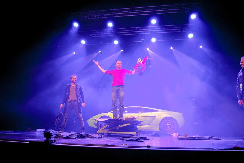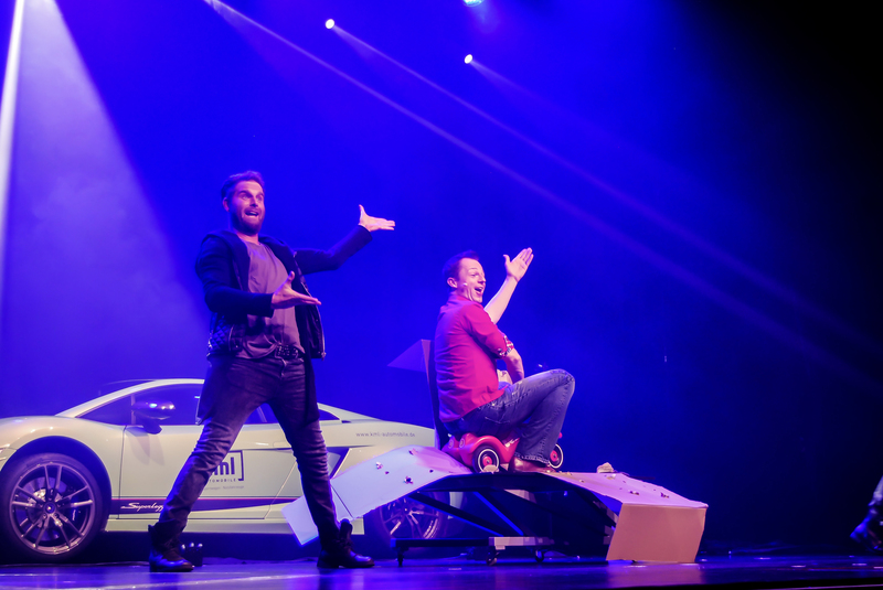 Um 19.30 Uhr öffnen sich die Saaltüren, die Bühne ist mit viel Atmosphäre ausgeleuchtet und nur durch einen durchsichtigen Vorhang leicht verdeckt. Dieser wird zu Beginn der Show als Leinwand benutzt. In einem Video sieht man Marc & Alex wie sie mit einem grünen Lamborghini die Landstraße entlang düsen bis sie bei einem Schloss in Süddeutschland ankommen. Dort werden Sie von einem Moderator begrüßt und lassen dann das Schloss vor den Augen einer Gruppe Zuschauer verschwinden und später wieder erscheinen. Unter lautem Applaus des Publikums fällt die „Leinwand“, gleich im Anschluss zünden Fontänen und das gerade noch im Video gesehene Sportauto ist mitten auf der leeren Bühne erschienen. Was für ein Auftakt!