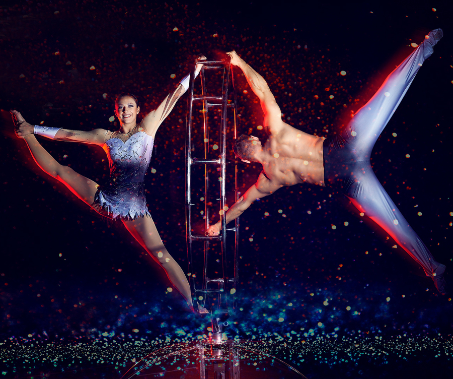 Das polnische Duo zeigt ruhige, anmutige und atem-beraubende Artistik. Kombiniert man weibliche Grazie, sowie Flexibilität mit männlicher Kraft und Koordination entsteht die wundervolle Performance des Duo Focus.